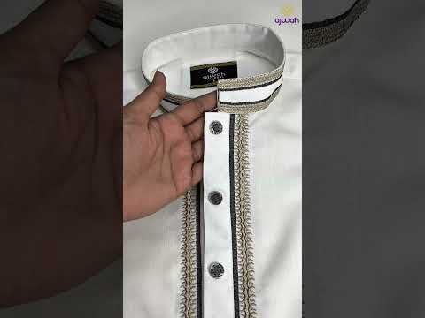 The rich pearl-white fabric is highlighted with delicate golden and grey embroidery, giving the outfit a royal touch while keeping the design elegant and minimal. Its structured collar, refined button placket, and detailed sleeve work showcase fine craftsmanship from every angle.